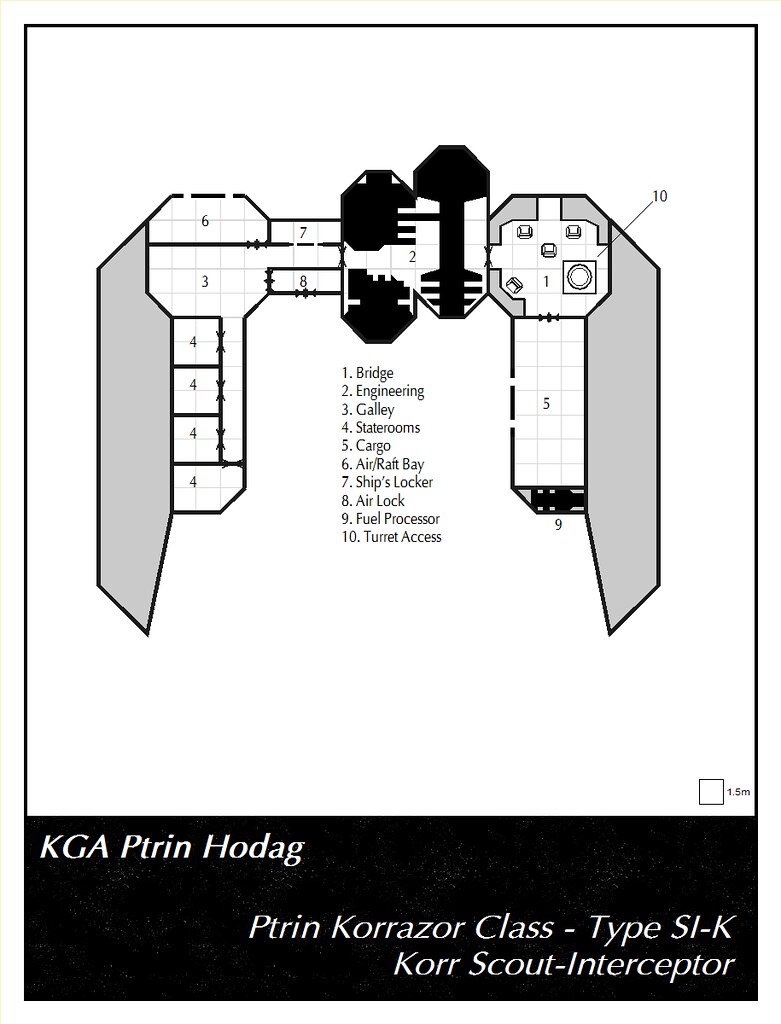 The Korr philosophy of shipbuilding is one-upsmanship with neighboring sophonts in raw power and speed, usually at the expense of systems other races might consider important. The SI-K meets this philosophy in terms of speed, primarily; it can achieve Thrust-4, making it significantly faster than most Scout-sized vessels. Much of its 100 tons is taken up with a Class B Manoeuvre Drive, the Class B Power Plant required to power it, and the 28 tons of fuel needed to run the Power Plant for 2 weeks and one Jump-2. This means the rest of the ship is cramped, crowded, and considering the age of most of these vessels, unpleasant, even to the Korr. Engineering itself is packed so tightly that crew have to duck under the Jump Drive conduit to traverse from side of the ship to the other. There are four staterooms for crew. Originally, the KGA envisioned 8 crew in double occupancy: 1 captain, 1 engineer, 1 gunner, 1 navigator, and 4 marines who would also crew the included Air/Raft, allowing for a fast ship to deliver a small assault team. However, the tension of all those crew in such a small space caused difficult morale issues, and crew requirements were relaxed. The SI-K could theoretically be flown with one skilled Pilot, but most crews also include an Engineer and Gunner/Marine. One triple turret is mounted within the bridge module, and standard armaments are 2 pulse lasers and a missile launcher, though in the after-market, any sort of weaponry can be found on the hardpoint.